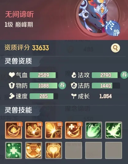 谛听技能推荐高级法连、高级法爆等,备战位替换高级防御。加点1根骨 + 1耐力 + 3灵性,性格选冷静。
