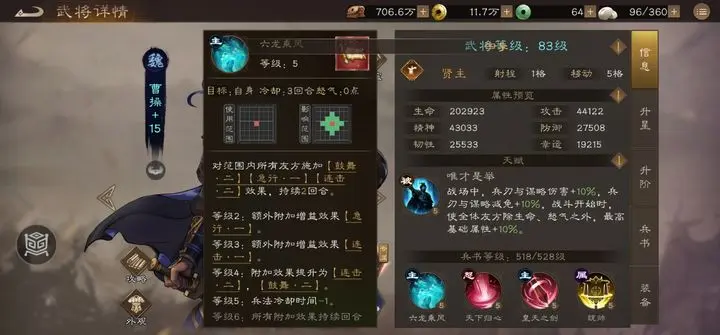 2.兵书配置:首本22级兵书优先强化六龙乘风,缩减冷却实现单场3次释放。