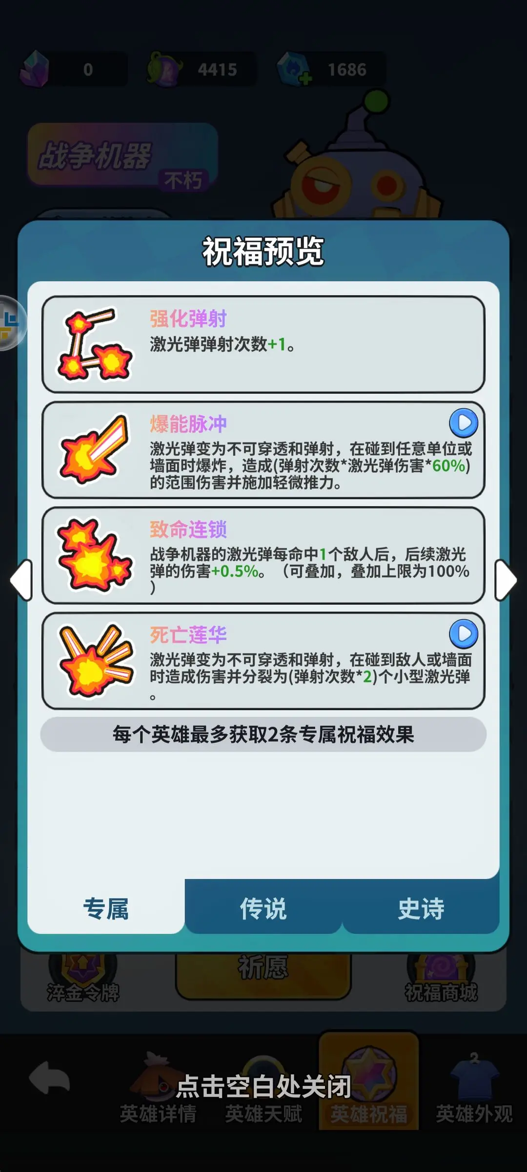 除空空大圣外,全员需解锁四天赋。拳鸡推荐雄鸡霸拳祝福,战争机器必备爆能脉冲和强化弹射,狂暴兽人需横扫千军,空空大圣必带火眼金睛。传说祝福方面,核心输出需配备贯穿和超限组合。