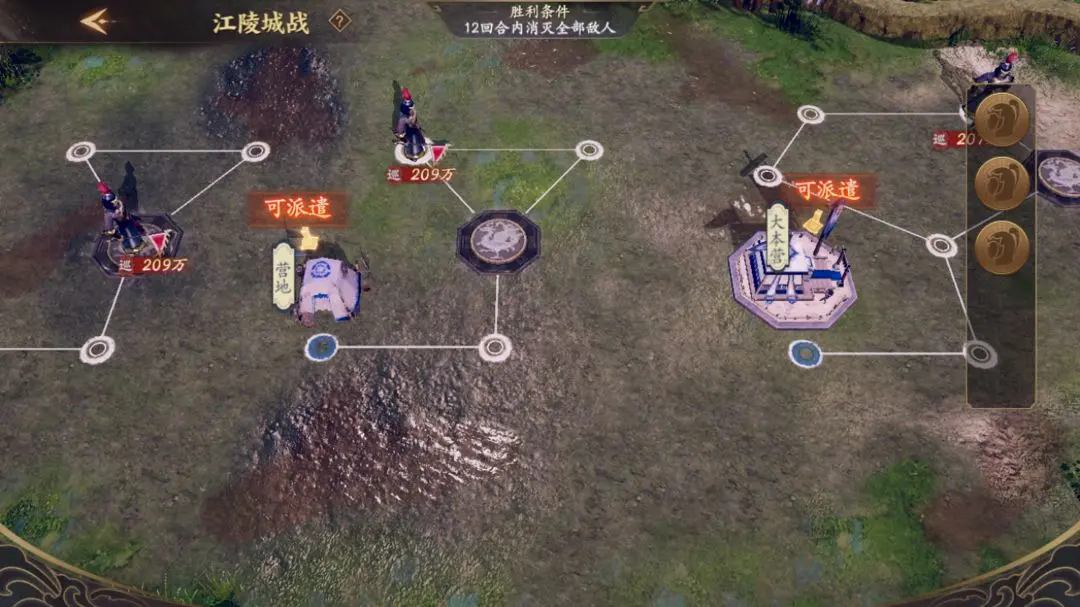 后续阶段根据战场情况灵活推进,当发现己方战力低于敌军且可能被巡逻队攻击时,应及时控制队伍向前移动规避冲突。江陵城战共有12回合限制,时间充裕不必急于求成。