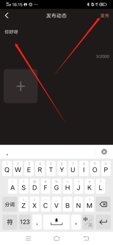 3.输入要发表的文字内容并添加图片,最后点击右上角“发布”,就能成功发布个人动态。