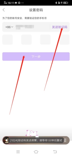 4.通过已绑定的手机号获取验证码,输入后点击下一步。