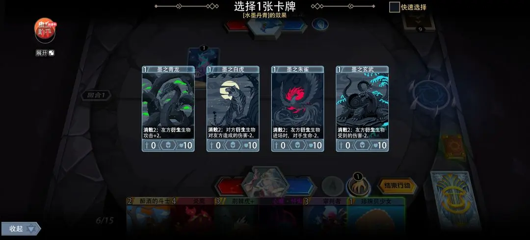 水墨丹青的特殊胜利条件是场上同时存在四种不同的圣兽墨画(青龙、白虎、朱雀、玄武),其精髓在于通过生物主动离场("自杀")快速减少主动技能冷却,加速圣兽铺场。