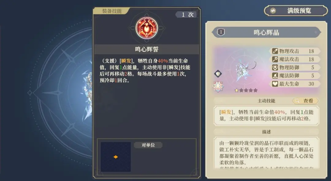 自残甲,目前只有丹丹和sp麦莎可以使用。低星的预冷却注定是高星启用。但是高星效果非常强悍,每回合可以回复一点能量并且额外移动3格。扣自身40%的生命值完美搭配丹丹个性获取个性技能。
