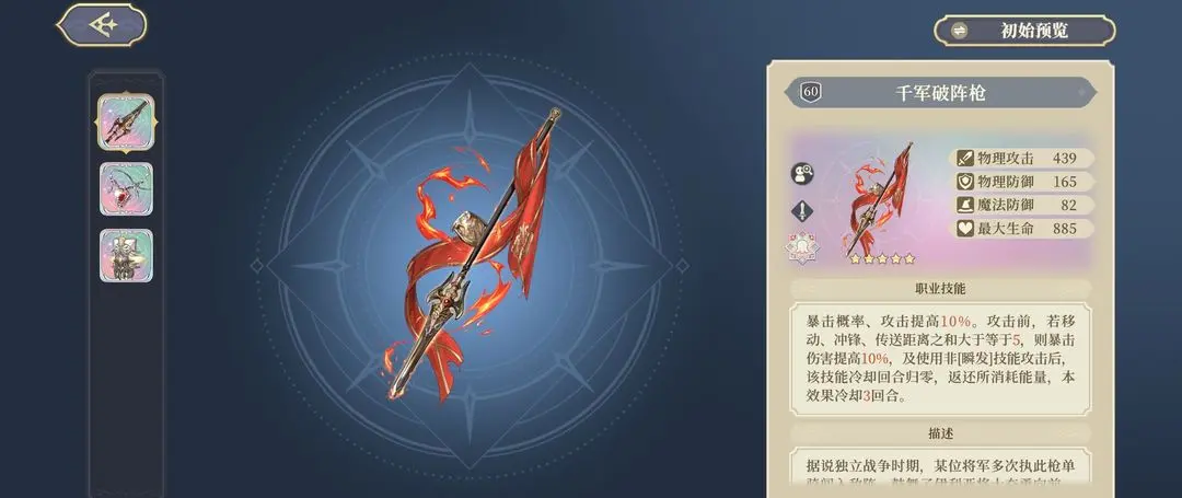总结就是不用弓箭角色,不要抽这专武,效果一般,60暴击率而且得4格距离才能吃到法正常是不缺暴击率所以并不刚需这把专武。其他弓箭角色可能能更好暴击,但是弓箭角色似乎并不强势。