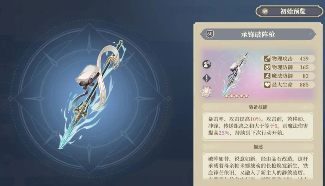 从第3期专武到现在为止,最强力法系专武,效果强大,触发条件简单。魔攻10%的提升和战斗开始和回合外攻击时额外获得净罪效果有恐怖的25%暴击率和30%爆伤,使得sp萨一跃成为最强群体角色。并且25%的暴击率搭配sp萨的天赋使得萨更好达到百分百暴击率(官方算计好的吧,铃兰sp角色怎么这么逆天)
