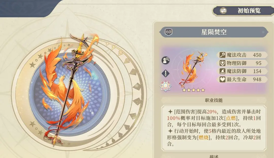 第二词条补全了火魔女第一回合敌方脚下没燃烧地形的缺陷,适配火魔女高阶的4豆5豆大招,也可以更好触发火魔女个性,但是有2回合冷却可能有点卡手,而且经常看专武的玩家会发现,现在专武一星还不如棱镜。所以不是奔着5星还是别抽了。