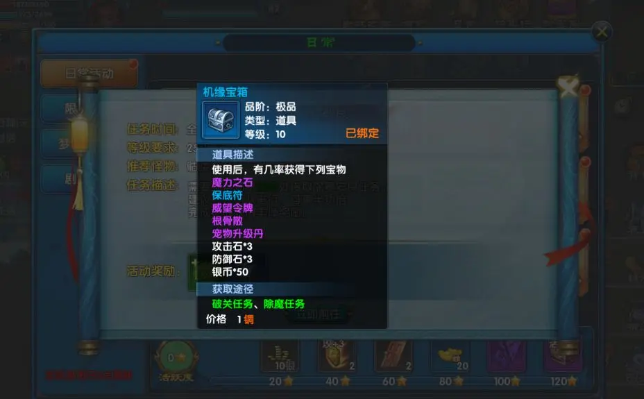 完成除暴安良任务可获得大量经验值奖励,是快速升级的重要途径。机缘宝箱包含多种珍贵道具,开启后概率获得魔力之石、宠物升级丹、属性石等强化材料,对角色成长具有重要价值。