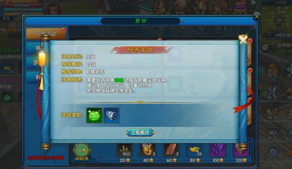 每日优先完成除暴安良任务以获得最大收益。接取任务前先查看其他任务目标,优先选择怪物重合度高的地图进行挑战。组队时建议搭配不同职业,利用群体技能提高清怪效率。