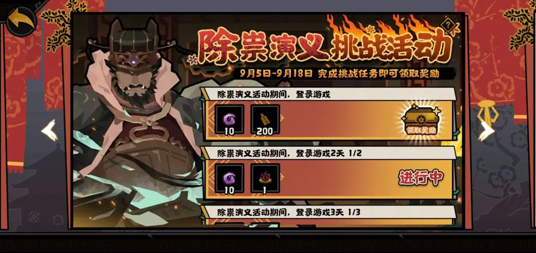 9月5日至9月18日,降妖除魔!除祟演义挑战活动也将一同登场!活动期间完成挑战活动即可领取奖励,玄玉、纹石、烛龙之眼......丰富道具等你来拿!