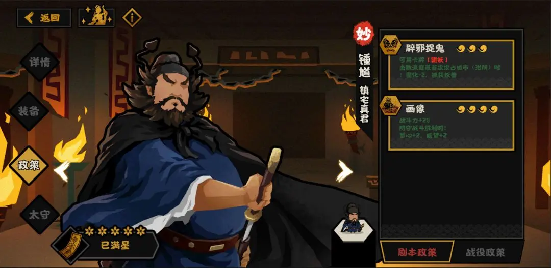 施行锺馗‘辟邪捉鬼’技能后,可用卡牌【驱妖】。击败流寇或首次攻占城市(治所)时,腐化-2,并且抓获妖兽;