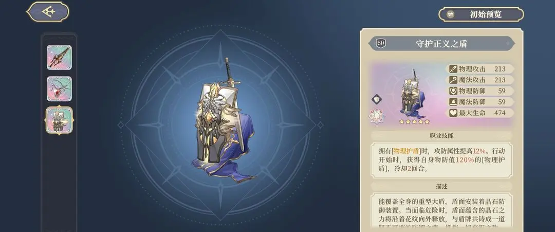 朴实无华的套盾加属性,基本所有角色都可以使用,这把确实没有什么专一性。但也有个槽点就是盾破了就没有效果了,所以为了吃满效果建议还是不要跑人堆里面让怪打。并且低星护盾很低很低基本没有,主要还是吃了给物理防御的亏但是是目前几乎所有角色的毕业装备。推荐多攒