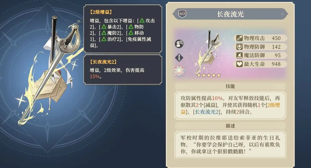 最好用的单手剑之一,不论是10%属性加持还是debuff驱散都很常用,长夜的15%伤害加成也非常强悍,但是只有5星才能有长夜2的增益。除了小索,sp王女也能使用。王女使用甚至比带专武效果好