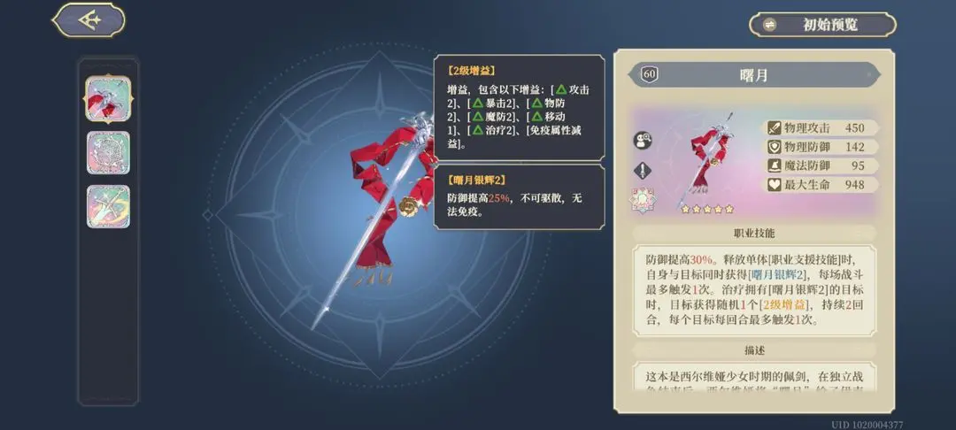 30%的防御提示和额外25的防御提示可以最大限度拉高使用者防御但是铃兰防御是最没用的词条。治疗有辉月银辉的角色后会额外给予二级增益,不过一般般。