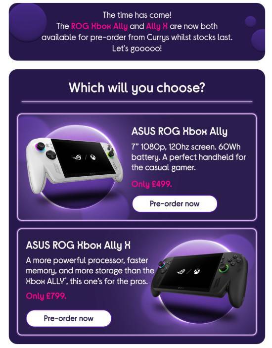Xbox掌机Xbox Ally X的售价曝光。根据英国零售商Currys发给客户的一封电子邮件,Xbox Ally和Xbox Ally X在英国的售价为499英镑/799英镑。