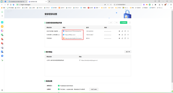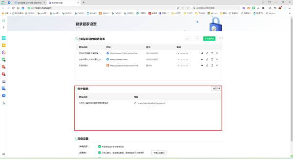 三、如果登录管家列表可以正常加载的话,查看这个网址在不在【例外网站】的列表中,如果在的话,将它在例外网站列表中删除掉即可。