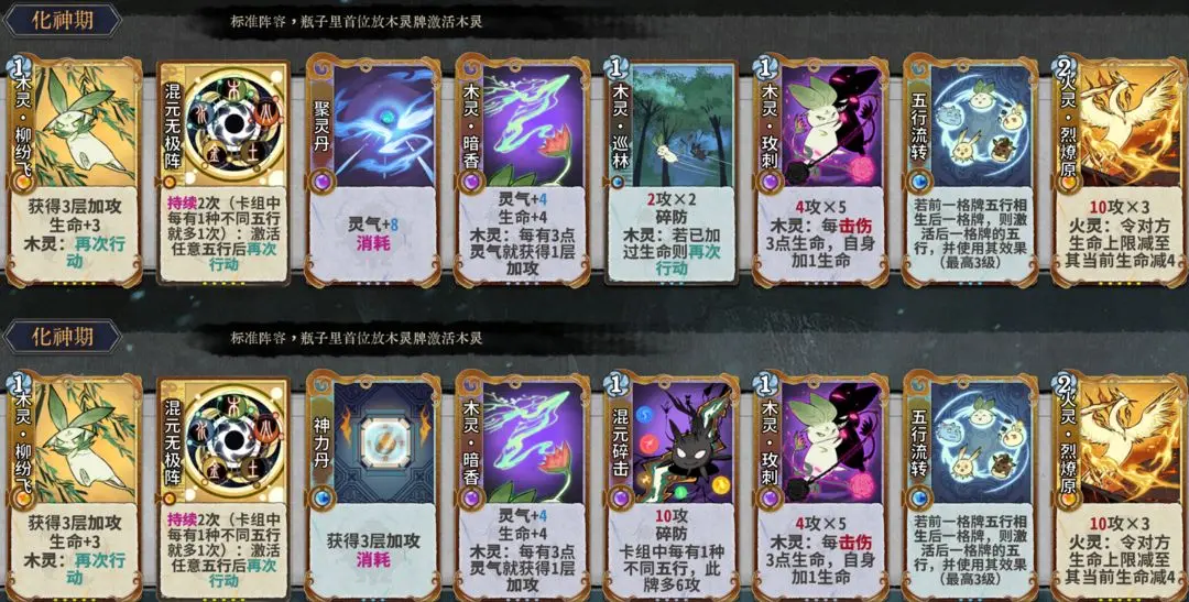 元婴期关键牌:神力丹、聚灵丹、木灵暗香、木灵巡林、木灵玫刺、五行流转、混元碎击。
