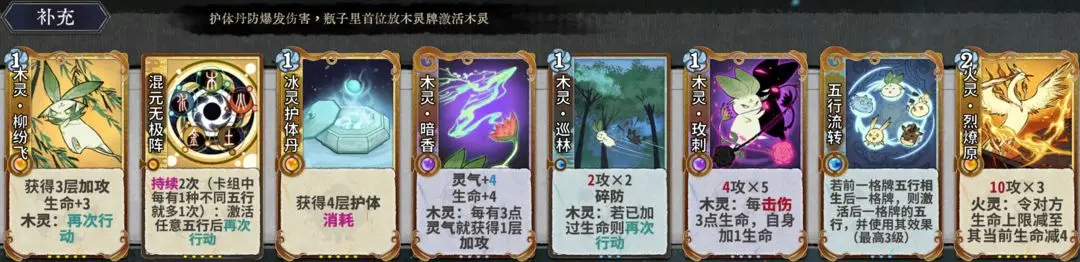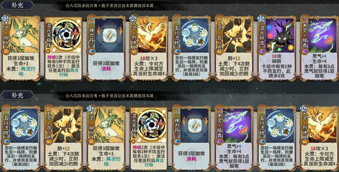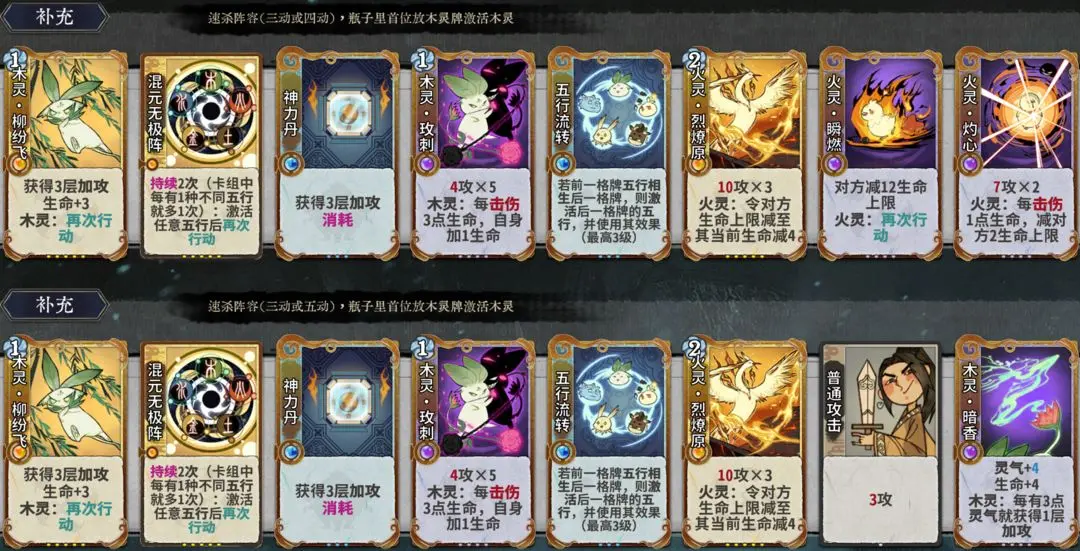 瓶子里首位放金灵牌激活金灵,质量够高时有机会三动或四动杀,最后1张牌还可以改为腾浪/水印,单纯多提供一种五行,不激活水灵效果,这样的好处是如果四动没杀死对手,还可以继续转回来打,灵气充足,混元无极阵的再次行动次数至少也够打2圈伤害。