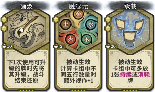 当混元无极阵仅1级时,还可以使用画龙刻印或融混元刻印过渡,升级混元无极阵,增加自己的再次行动次数。当有混元无极阵时还可以使用承载刻印配合,第三张消耗牌根据需求在护体丹、驱邪丹、神力丹、聚灵丹中选择。