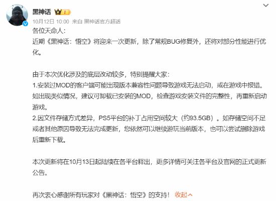 黑神话悟空今日(10月13日)起各平台陆续推送重大更新!此次更新有常规修复与性能优化,但因底层结构调整,装过MOD的玩家可能遇兼容问题,更新前建议卸载MOD。PS5补丁体积大,空间不足可继续玩旧版或重下,详情看官方正式公告。