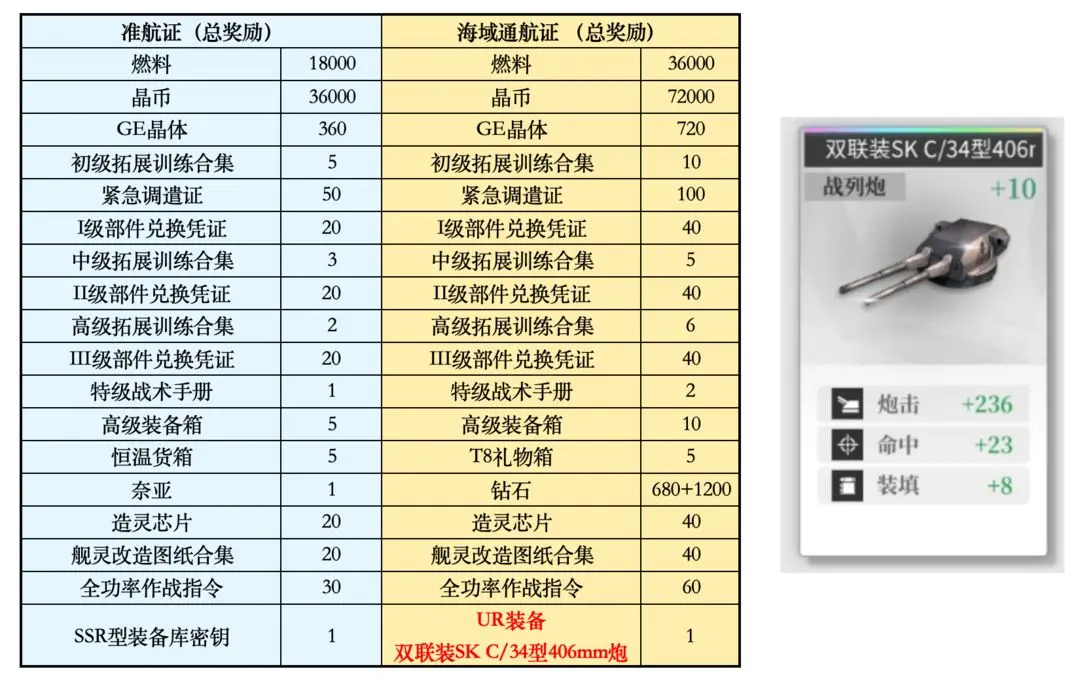 游戏设「准航证」和「海域通航证」两种,任何指挥官均可以进行及领取「准航证」的任务和奖励,而「海域通航证」需要付费解锁。