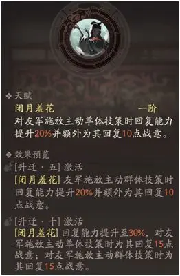 核心技能翩若惊鸿,在战棋游戏里没有人可以拒绝一个为友军再动的技能,何况该技能还可以增加战意,升级后还可以使buff回合+1且debuff回合-1,属于必带技能
