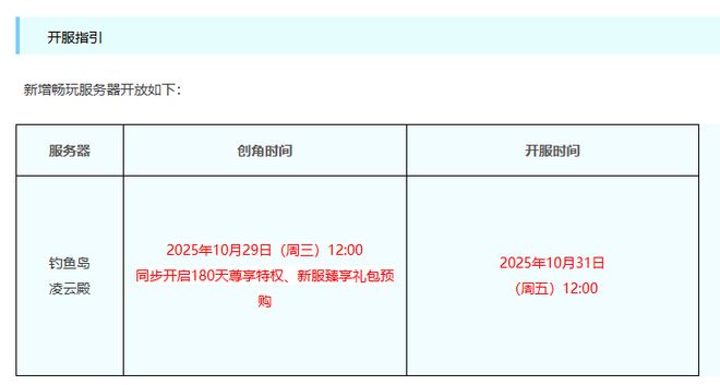 本次新区创角和购买尊享绿通时间为2025年10月29日12:00。本月畅玩服已开启五组新服务器,选区前需综合考虑。