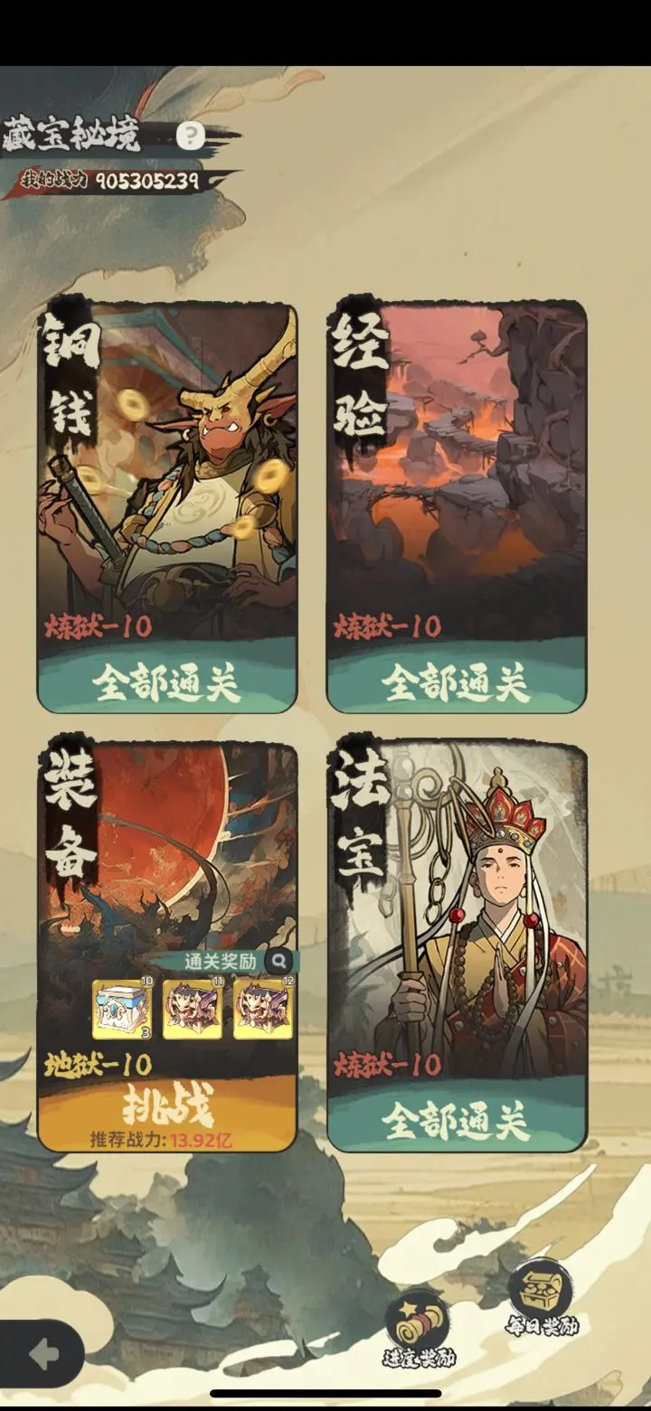 法宝:开图鉴为主(就是先一样拿一个),前期可以优先开紫橙宝的图鉴凑共鸣,试炼商店每天刷满,出红就攒1w残片换,都别用玉买,金宝就每天固定买券抽凑保底次数,开了灵山问道可以换限定金