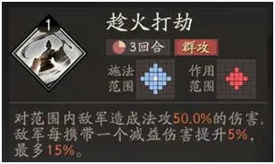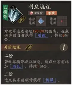 核心技能刚戾诡谋,单体伤害且战前获得刚毅效果(用双抗的1.3倍代替法攻),持续3回合,升级后还可以使有debuff的敌人混乱一回合,当敌人已经携带debuff时还可以获得20%吸血,另一个普通技能则是选择趁火打劫,造成AOE伤害的同时还能根据敌军的debuff数量提升伤害,非常适合程昱