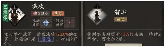 两个通用技能谋攻和智迟基本上不会携带,前者是一个附带dot的单攻,而后者则是几乎没什么效果,因此放弃