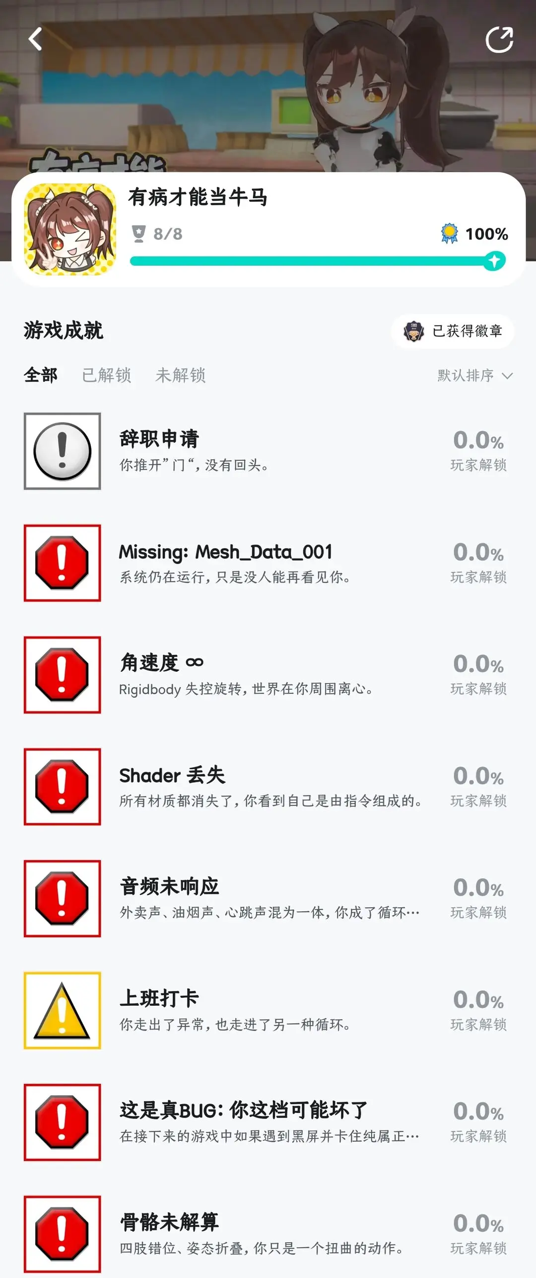 八个成就中,1个TE成就,1个NE成就,5个是BE成就(被bug侵蚀后的成就),1个隐藏成就。