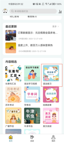 1.在应用主界面底部的推荐栏目中,定位并进入语法练习模块。
