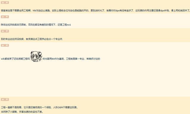 也有不少玩家在评论区中进行回怼,其中一个核心观点就是除非达拉然拍卖改无限制,否则在各方面都没有差别的情况下,还是工程学第一。确实,工程学可以提供别的专业不可能有的便利,比如说达拉然拍卖行机器人以及全球传送网络,这些时间收益同样是收益。尤其是对于一些有需求或者是对于一些老板来说,节省时间就是节省金钱。所以很多情况下,既然属性收益一致,那么为什么不能选时间收益更好的呢?