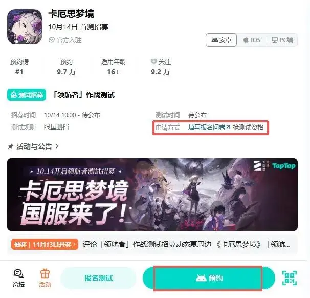 参与预约活动也有机会抽取测试资格: