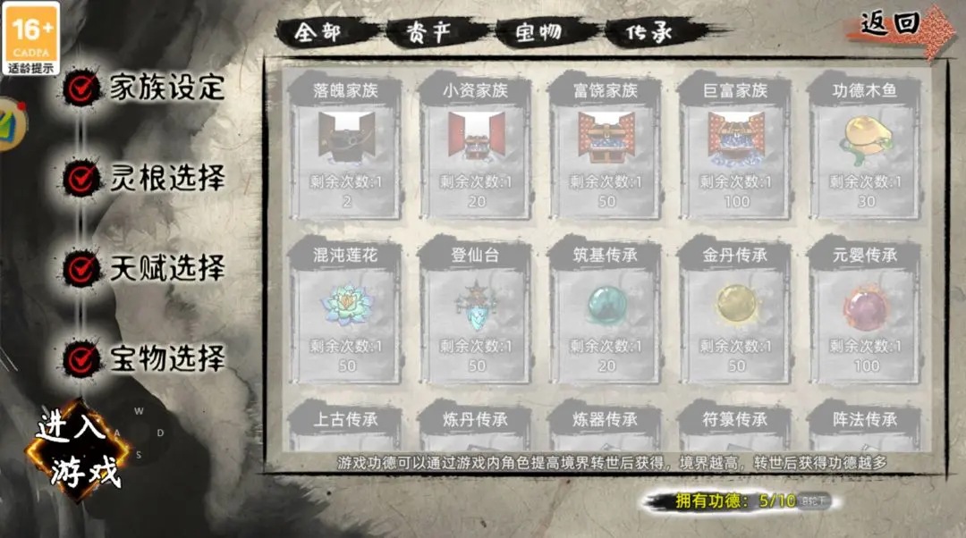 花费五功德,忽略未使用完的功德直接进入游戏。剩余功德在局内选蓝色天赋精气旺盛,花费五功德。过完新手教程后,解锁五个红尘塔挂上弟子搞灵水,再将田升到最高级,用水催生聚灵草,让炼丹属性最高的弟子练修为药,注意别让丹毒为零。