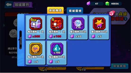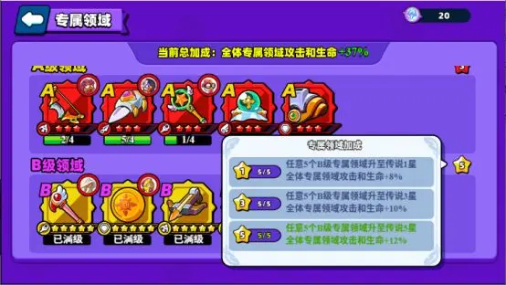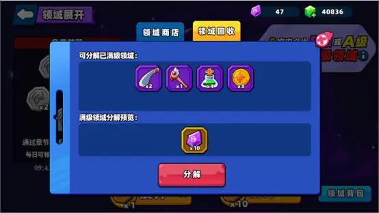 领域升级:升到指定星级激活专属加成;任意领域满级后解锁领域商店,可分解满级领域兑换道具。