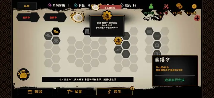 进入政策界面后,别急着乱点。先点科技消耗士子,把科技发展起来,后续再点其他民生政策。具体能点哪些民生政策,可以参考游戏内的图示说明。
