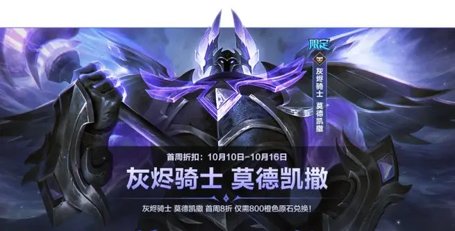 灰烬骑士 莫德凯撒已于10月10日上架战利品商城。10月10日-10月16日活动期间,首周可享8折优惠,使用橙色原石*800即可兑换~