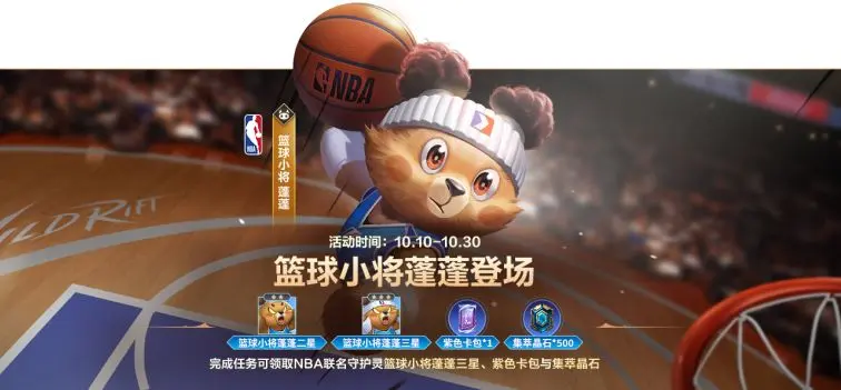 篮球小将 蓬蓬来袭!10月10日10:00-10月30日23:59活动期间,召唤师完成任务即可领取NBA联名守护灵-篮球小将 蓬蓬(三星)、传奇图集紫色卡包、集萃晶石*500好礼~