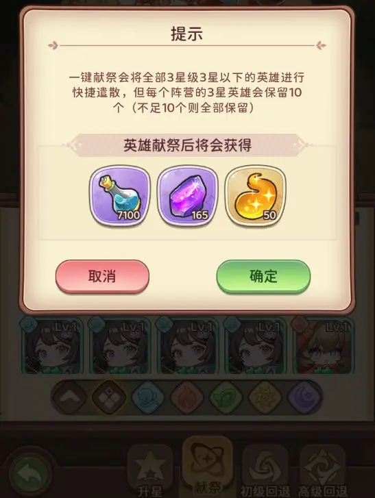 升星台 - 献祭处可以献祭多余的英雄或者2星英雄。献祭后能获得英雄经验和进阶石,这是处理多余英雄的好方法,还能顺便获取资源,大家有闲置英雄不妨来这里献祭一下。