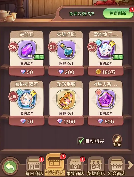 神秘商店每天免费刷新5次,钻石还能额外刷新100次。大家刷商店的时候,主要勾选进阶石和英雄经验。不过要是金币不够,就不建议用金币购买资源了,毕竟金币还要留着升级英雄。