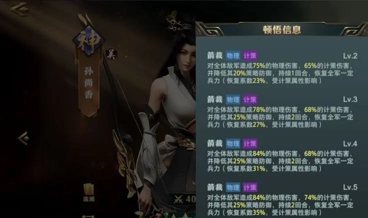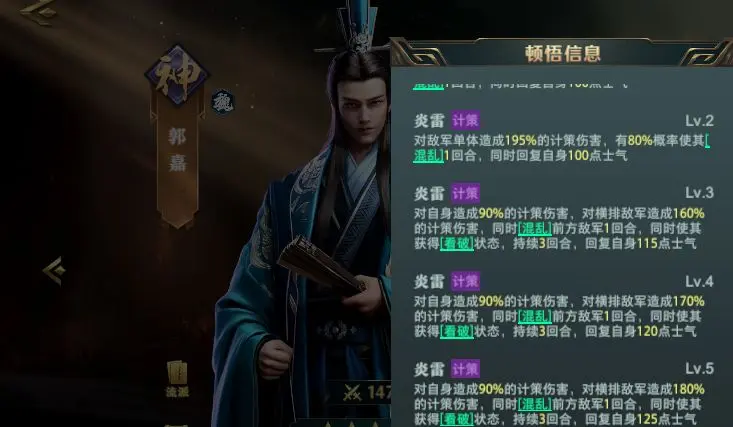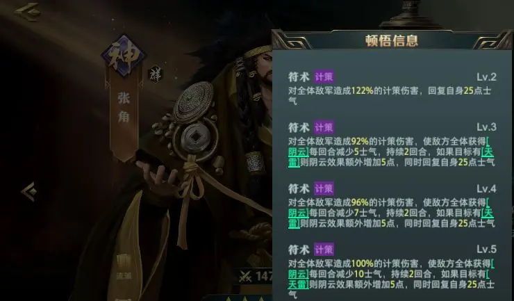 张角顿悟三阶后解锁【阴云蔽日】,施加持续2回合的易伤效果。张宁的【五雷轰顶】在造成伤害的同时触发天雷,与阴云形成双重增伤。该组合需确保张角速度领先,建议装备【先机】兵书提升先手概率。
