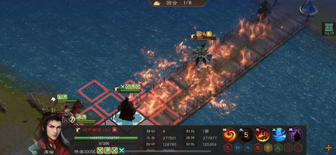 战斗开始,周瑜率先上前施展火攻技能。这一技能不仅能对徐庶造成直接伤害,还能改变战场局势,为后续攻击创造有利条件。周瑜火攻后,貂蝉立刻使用回归技能,让周瑜再次获得行动机会。