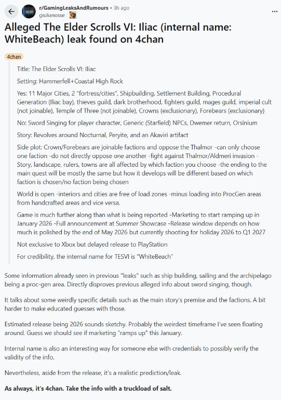近日游戏圈热闹非凡,一则疑似上古卷轴6内部信息的英文长贴在外网疯狂流传,瞬间点燃了众多玩家的热情。这则帖子披露了大量游戏细节,从背景设定到玩法内容,再到技术特点和开发进度,全方位地展示了这款备受期待大作可能的样子,究竟这些爆料是真是假,一起来一探究竟。