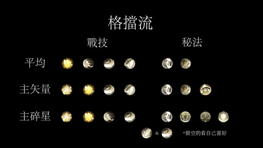 格挡流主要以矢量回弹和碎星斩为核心,只有二转的骑士可以用超重击代替碎星斩。格挡流的重点是满格挡,所以如果需要,凑100%格挡率。如果你是主升矢量回弹,那么大多数威胁来自Boss,你需要更多的抗伤技能,比如水盾,或者加倍奉还提升超重击或者碎星斩的伤害;如果你主升碎星斩,那么你需要更多的防御去降低小怪的伤害,或者携带冲撞快速清理小怪。玩格挡流几乎必带的另一个一个战技就是鼓舞。因为矢量回弹是根据受伤次数进行反击的,所以鼓舞附带的固定增伤是打伤害的关键,因为每一段反弹伤害都能附带这个固定增伤。格挡流属于多段少量伤害,所以不是那么追求高会心率。格挡率提升会心率的主要目的是增加超重击或者碎星斩的伤害。