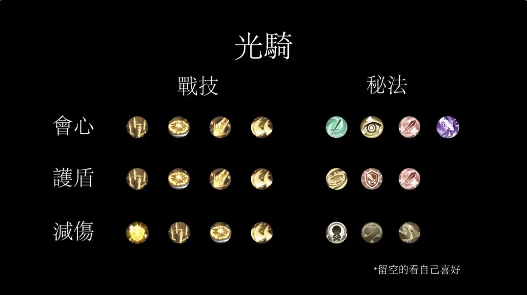 光骑很有意思,没有一个所谓的”核心”技能,意思是你的伤害不会出现50%以上都是由一个技能打出来的情况。光骑最帅的技能就是剑阵和幻刃,玩光骑不带这两个战技属于白玩了。剑阵可以触发4段,每一段都是群伤并且可以触发剑风和悲悯,所以我通常会带上这两个秘法。剩下两个战技其实可以自由搭配,喜欢会心的带战意,扛不住带弧光和水盾都可以,副本中可以带鼓舞。我自己会带牵制打伤害的同时带钢铁信念减伤,或者乘胜追击增加伤害。