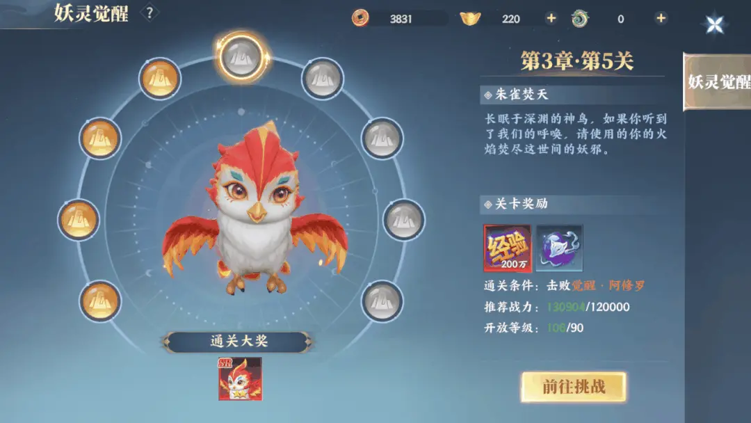 【开服不迷茫,跟着主线修仙】跟着主线走,不会错!前期就跟着主线任务做,能快速升级,还能体验游戏剧情。“妖灵觉醒”一定要打:1.通关送大量经验和培养材料2.打不过或打不了就先去“妖境”打装备或者过主线提升等级再来过完第一章你就有了第一只妖灵朱雀,记得把它放上阵!