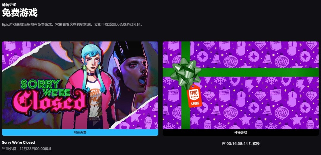 Epic公布了神秘游戏连送第五款,单人生存恐怖游戏《抱歉我们打烊了》(Sorry We"re Closed),领取时间截至12月23日0点。下一款神秘游戏将于12月23日公布。