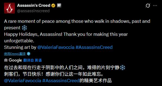 贺图附带的文字“献给那些行走于阴影之中,无论过去还是现在的诸位,一个难得的宁静时刻。节日快乐,刺客们!感谢你们让这一年变得如此难忘”,充满了对玩家的感激与节日的温馨问候。