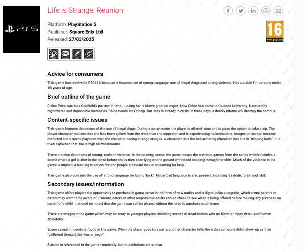 根据欧洲评级机构PEGI泄露的页面信息,奇异人生新游名为Life is Strange: Reunion,登陆平台为PS5,发行商是SE。不过奇怪的是,登记的发售日期为2025年3月27日,而目前SE还没有任何回应。
